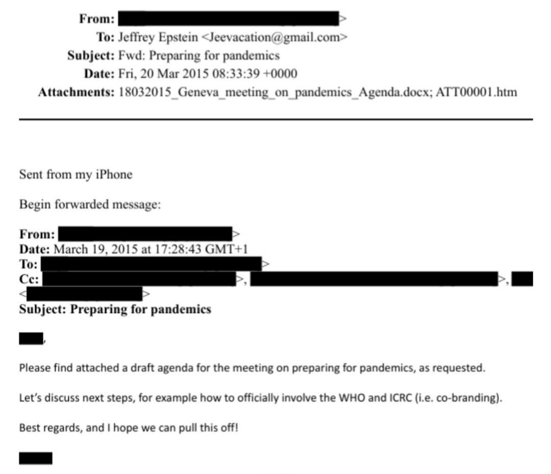 2015: Epstein erhält die Agenda für die Pandemieplanung, in der die WHO und das IKRK erwähnt werden.